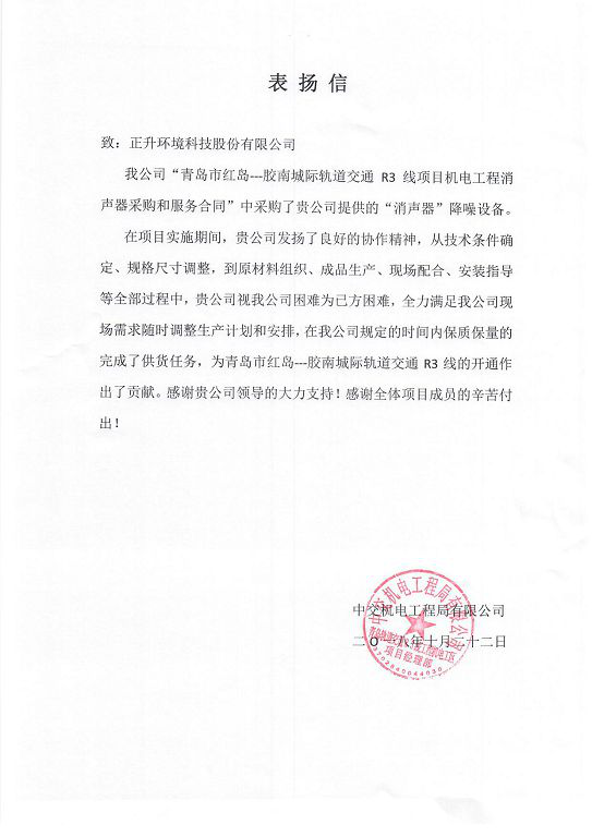 表揚(yáng)信最后,中交機(jī)電工程局青島軌道交通R3線項(xiàng)目部特別感謝正升領(lǐng)導(dǎo)的大力支持!感謝全體項(xiàng)目成員的辛苦付出!